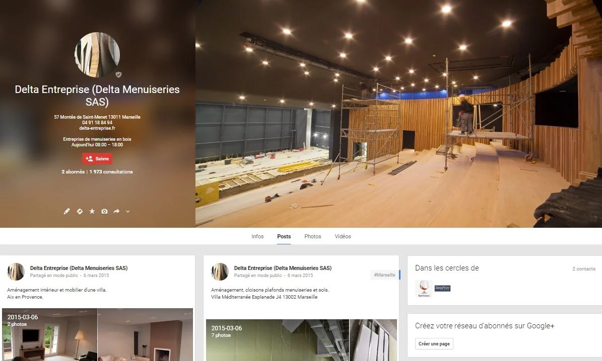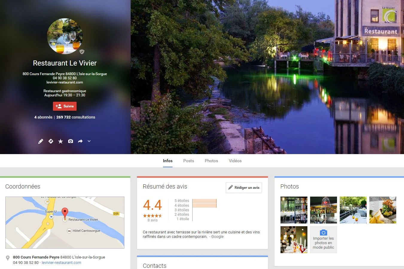 - la page entreprise Google+, de type "responsive design", propose au client qui vous trouve sur son téléphone, en un clic, de vous téléphoner ou d'afficher l'itinéraire Google Maps pour arriver à votre établissement