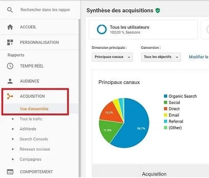 Voici les principaux canaux analysés dans Google Analytics :